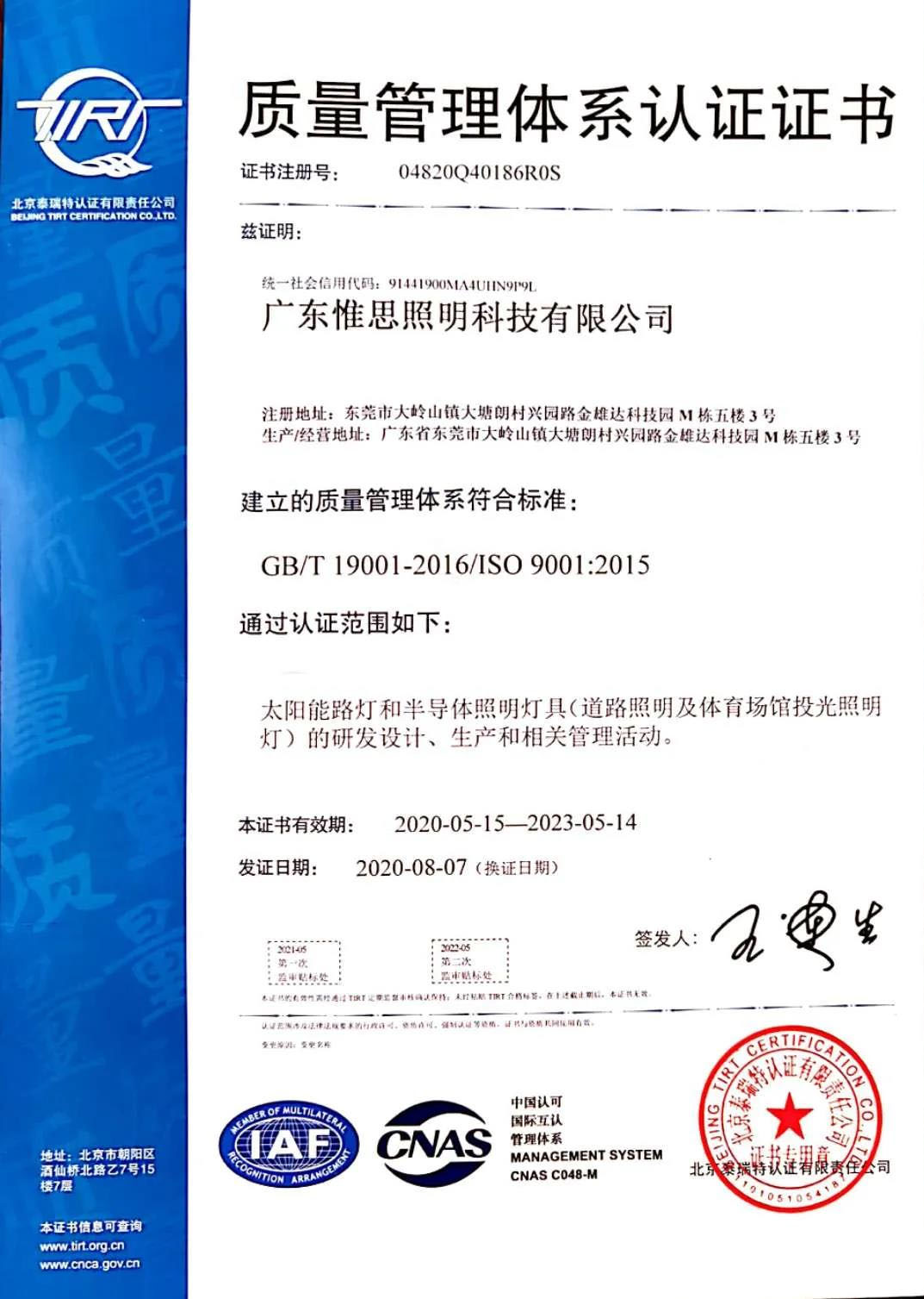 质量管理体系认证证书